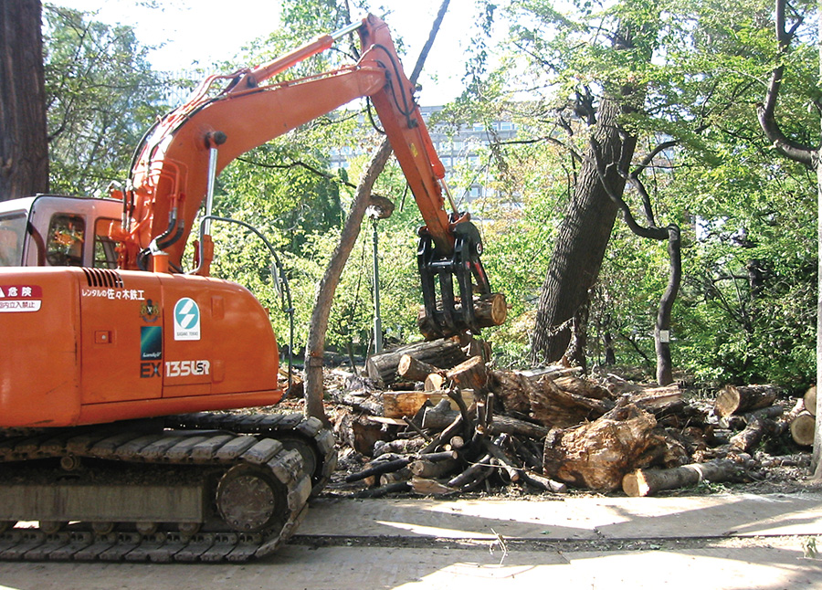 2004年の風台風、雨は降らずに晴れていましたが猛烈な風が樹木をなぎ倒しました。札幌の市街地も倒木で交通が遮断され都市機能は停止。写真①は道庁の前庭ですが山中で木を伐り出しているような光景でした。  一方の山間部も樹木がなぎ倒され、一部が川に流れ込み、下流域に押し流されます。写真②は沙流川上流部の二風谷ダム付近ですが、除けられた倒木が山積みになっていました。海岸のほうはさらにひどく、漁港にまで流木が流れ込んでいました。